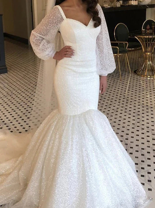 Sexy Mermaid Wedding Dress Spaghetti Sequins Lace Up Long Sleeves Sweep Train Tulle Bridal Gowns Custom Made