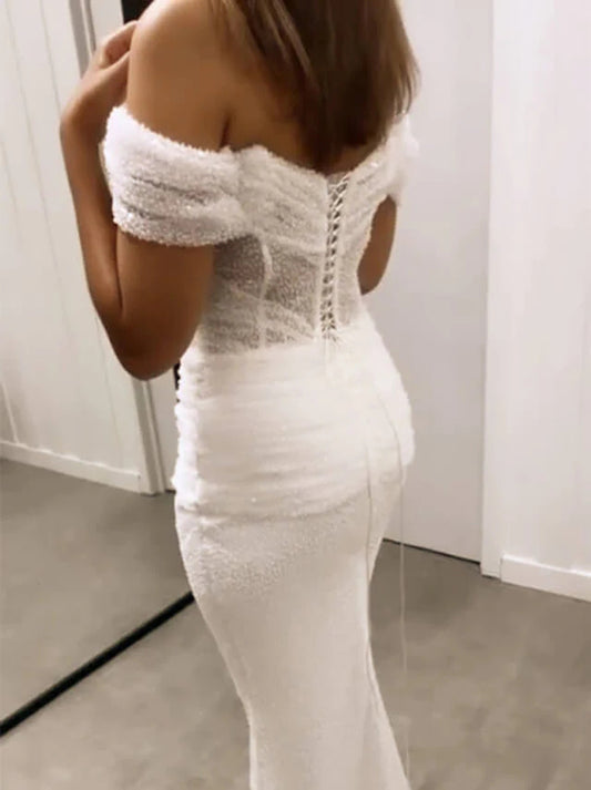 Sparkling Mermaid Wedding Dresses Strapless Off The Shoulder Lace Up Beads Sequins Sweep Train Bridal Gowns Custom Made