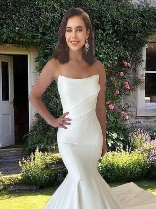 Simple Mermaid Wedding Dresses Strapless Pleated Sleeveless Sweep Train Satin Bridal Gowns For Women
