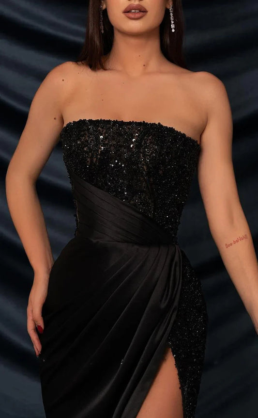 RP1865-Elegant Black Mermaid Strapless Sequins Ruched Sleeveless Satin Prom Evening Dresses Formal Party Gowns With Slit