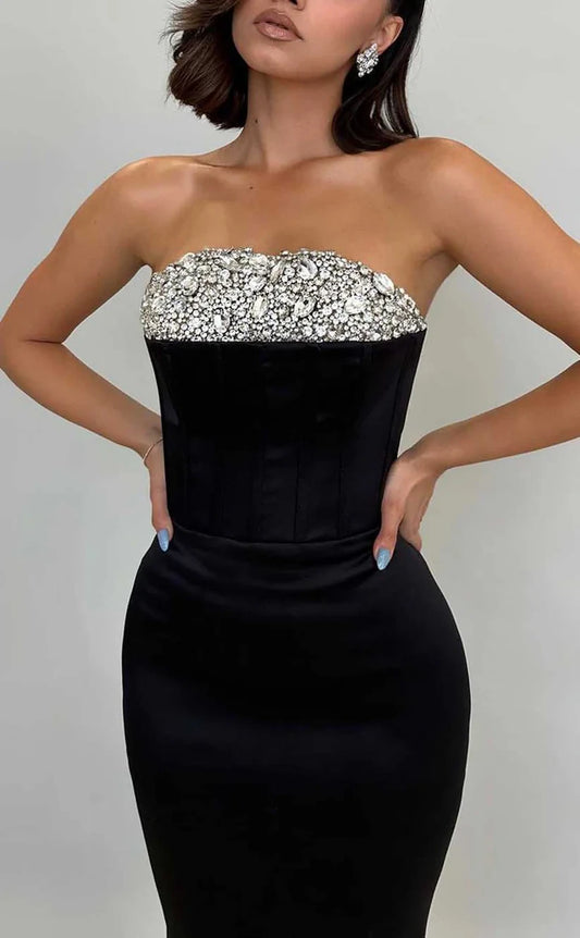 RP1911-New Black Mermaid Strapless Ruched Crystals Sleeveless Satin Prom Evening Dresses Formal Party Gowns