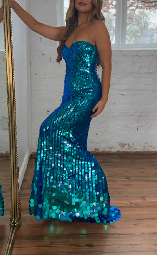 RP1898-Sparkling Mermaid Strapless Sequins Sleeveless Long Prom Evening Dresses Formal Party Gowns With Train