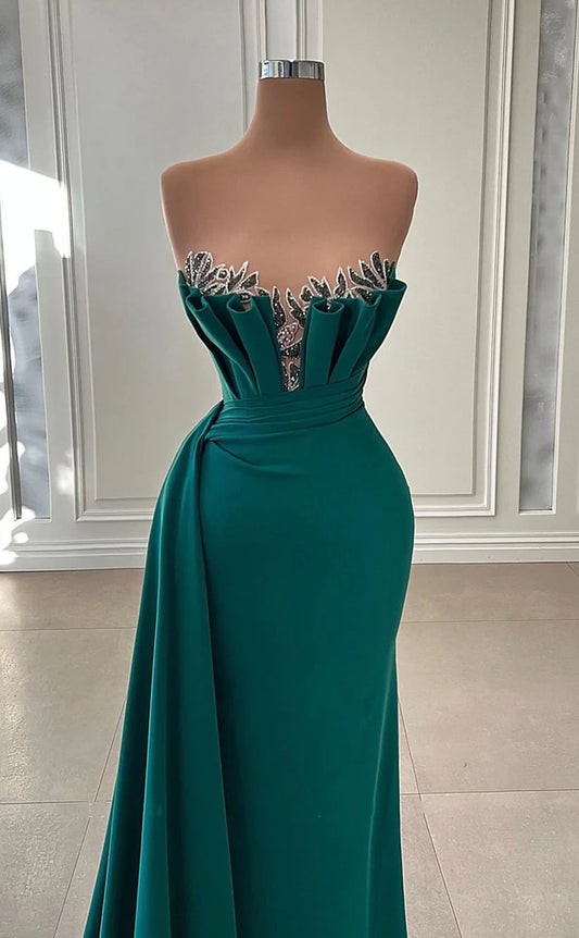RP1901-Elegant Green Mermaid Strapless Beaded Sleeveless Satin Long Prom Evening Dresses Formal Party Gowns With Slit