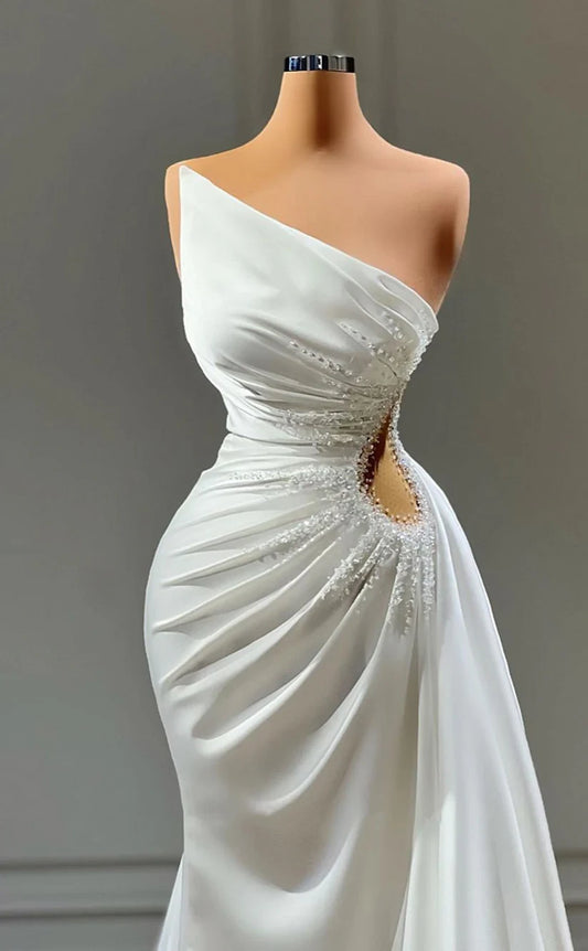 RP1902-Elegant White Mermaid Strapless Sequins Pleated Sleeveless Satin Long Prom Evening Dresses Formal Party Gowns With Cut-out