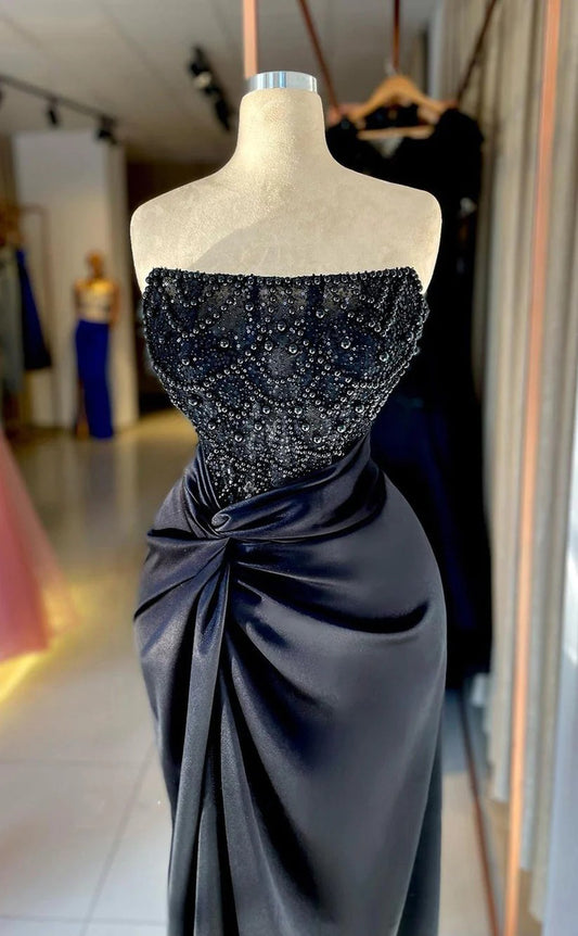 RP1542-Gorgeous Black Mermaid Strapless Pearls Sleeveless Satin Prom Evening Dresses Formal Party Gowns With Slit