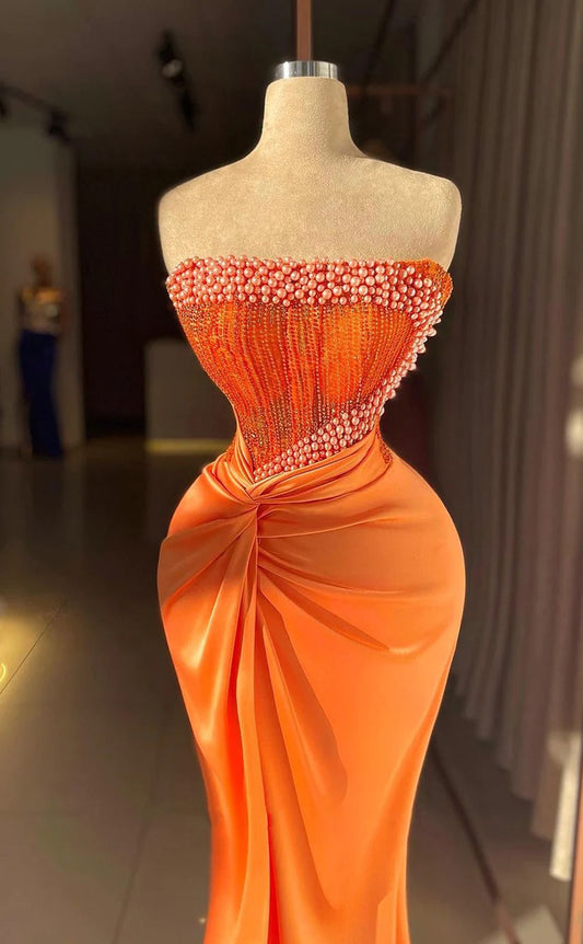 RP1544-Gorgeous Orange Mermaid Strapless Pearls Sequins Sleeveless Satin Prom Evening Dresses Formal Party Gowns With Slit
