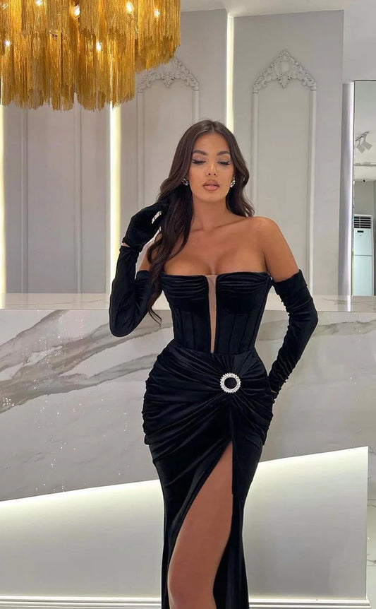 RP1524-Elegant Black Mermaid Strapless Ruched Long Sleeves Satin Prom Evening Dresses Formal Party Gowns With Slit