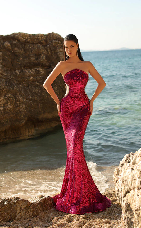RP1631-Hot Fuchsia Mermaid Strapless Crystals Cut-out Sleeveless Prom Evening Dresses Formal Party Gowns With Slit