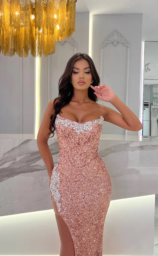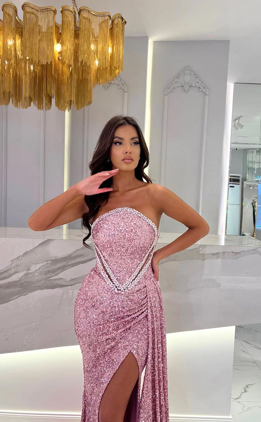RP1649-Hot Pink Mermaid Strapless Crystals Sequins Sleeveless Prom Evening Dresses Formal Party Gowns With Slit