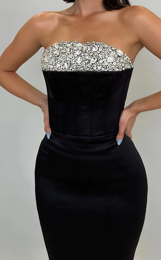 RP1462-Elegant Black Mermaid Strapless Crystals Sleeveless Satin Prom Evening Dresses Formal Party Gowns
