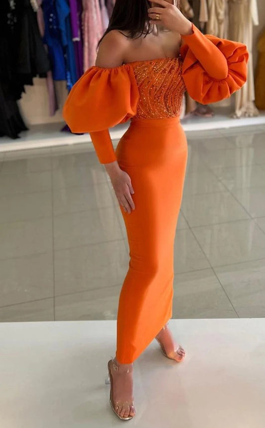 RP1421-Modern Orange Mermaid Strapless Ruched Sequins Puffy Sleeves Prom Evening Dresses Formal Party Gowns