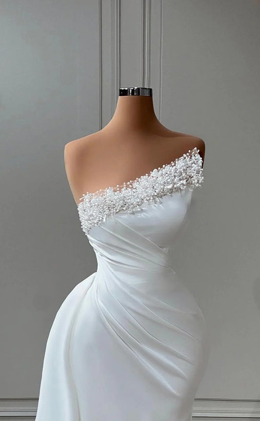 RP1443-Classic White Mermaid Strapless Beaded Ruched Sleeveless Prom Evening Dresses Formal Party Gowns With Slit