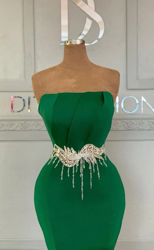 RP1240-Elegant Green Mermaid Strapless Crystals Ruched Sleeveless Satin Prom Evening Dresses Formal Party Gowns With Sash