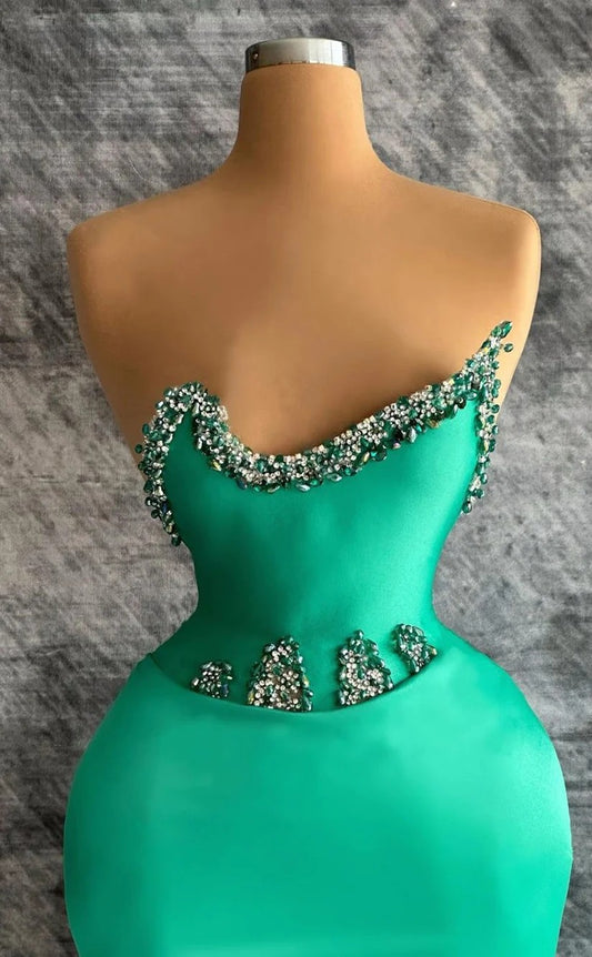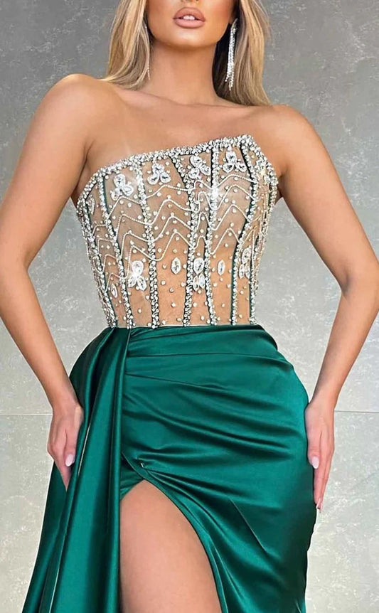 RP1256-Elegant Green Mermaid Strapless Crystals Sleeveless Satin Prom Evening Dresses Formal Party Gowns