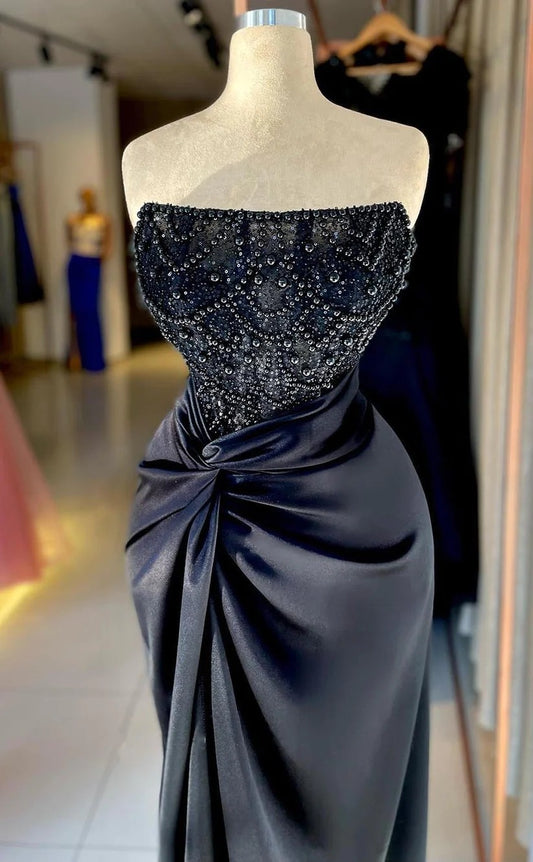 RP1362-Gorgeous Black Mermaid Strapless Pearls Sequins Sleeveless Prom Evening Dresses Formal Party Gowns With Slit