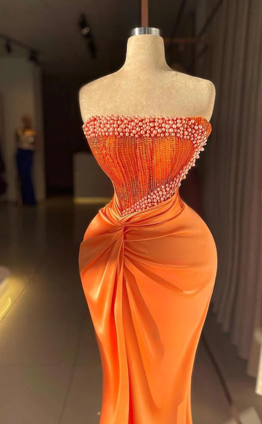 RP1367-Gorgeous Orange Mermaid Strapless Ruched Pearls Beads Sleeveless Prom Evening Dresses Formal Party Gowns