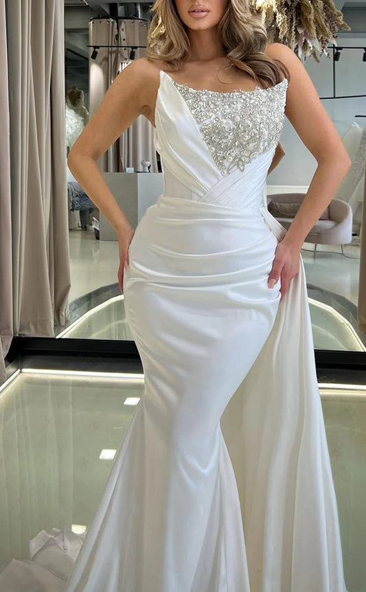 RP1237-Charming White Mermaid Strapless Crystals Beaded Sleeveless Satin Prom Evening Dresses Formal Party Gowns With Train