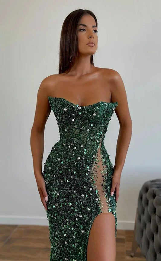 RP1232-Sparkling Green Mermaid Strapless Sequins Sleeveless Prom Evening Dresses Formal Party Gowns With Slit