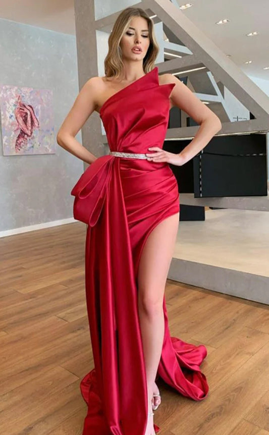 RP1140-Classic Red Mermaid Strapless Crystals Sleeveless Long Prom Evening Dresses Formal Party Gowns With Slit