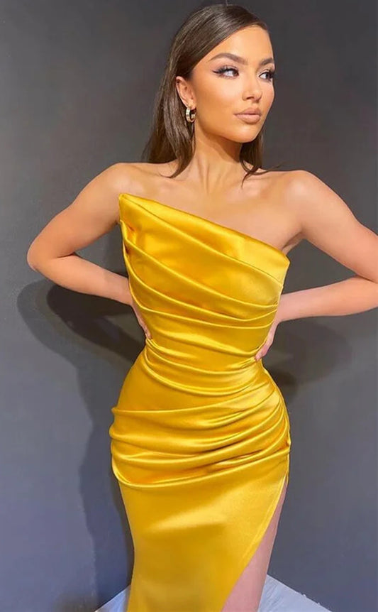 RP1074-Elegant Yellow Mermaid Strapless Ruched Sleeveless Long Prom Evening Dresses Formal Party Gowns With Slit