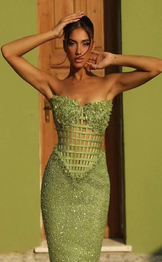 RP1078-Elegant Green Mermaid Strapless Sequins Sleeveless Floor Length Prom Evening Dresses Formal Party Gowns