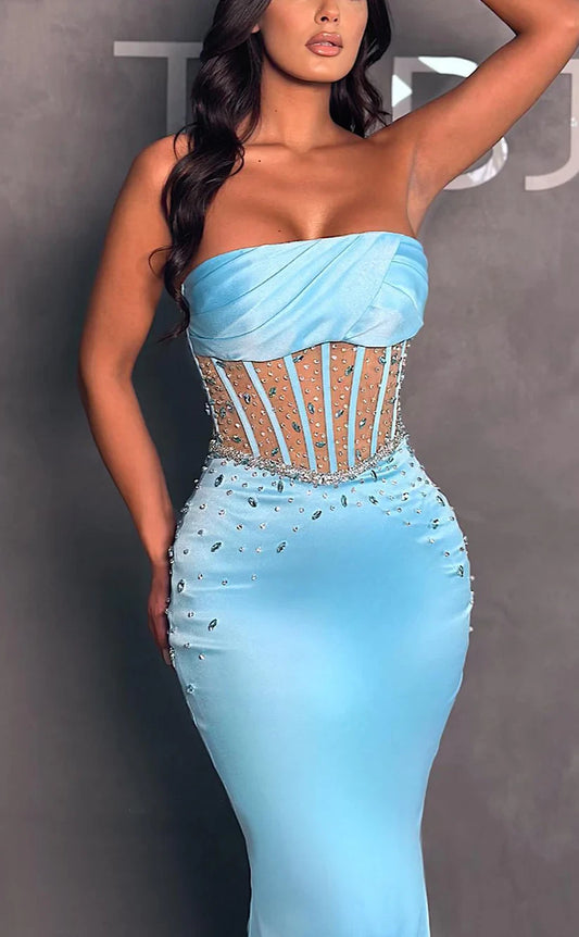 RP1024-Elegant Sky Blue Mermaid Strapless Ruched Beads Sleeveless Long Prom Evening Dresses Formal Party Gowns