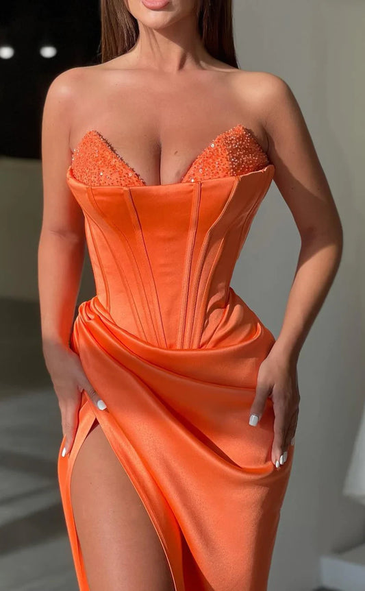 RP1471-Elegant Orange Mermaid Sweetheart Ruched Beaded Sleeveless Satin Prom Evening Dresses Formal Party Gowns With Slit