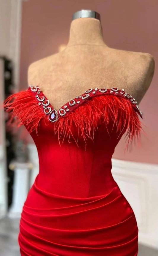 RP1397-Elegant Red Mermaid Sweetheart Crystals Feather Sleeveless Prom Evening Dresses Formal Party Gowns