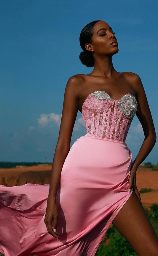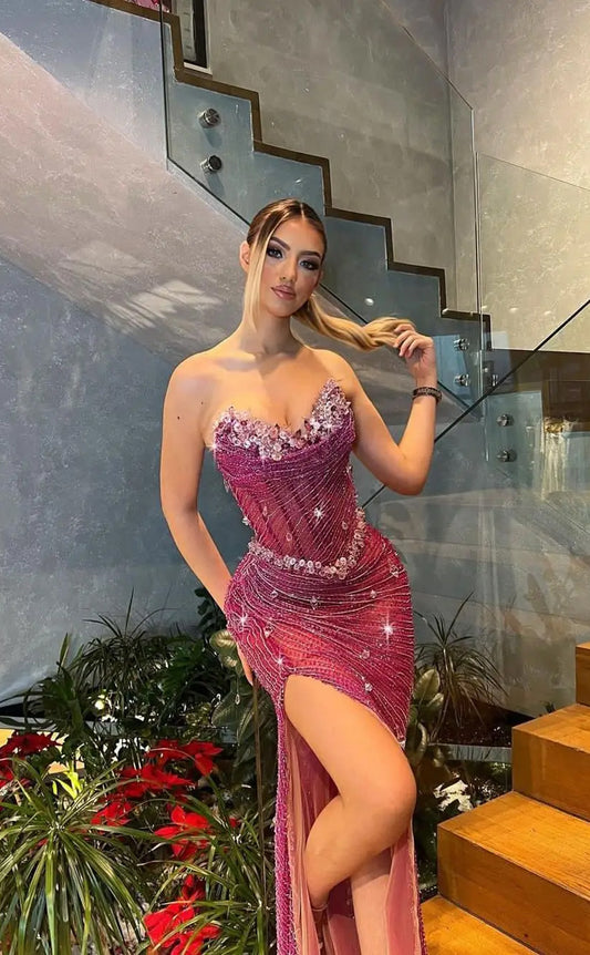 RP1138-Unique Pink Mermaid Sweetheart Sequins Crystals Sleeveless Long Prom Evening Dresses Formal Party Gowns With Slit