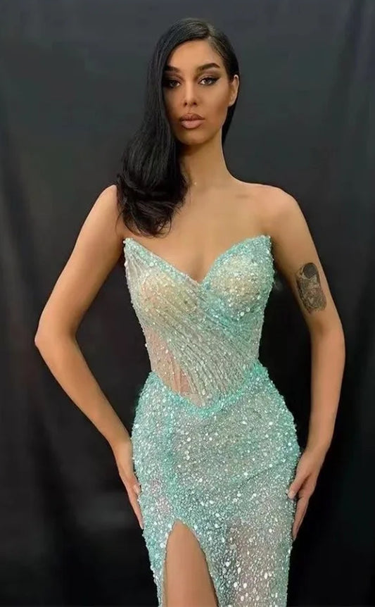 RP1141-Sparkling Green Mermaid Sweetheart Sequins Beads Sleeveless Long Prom Evening Dresses Formal Party Gowns With Slit