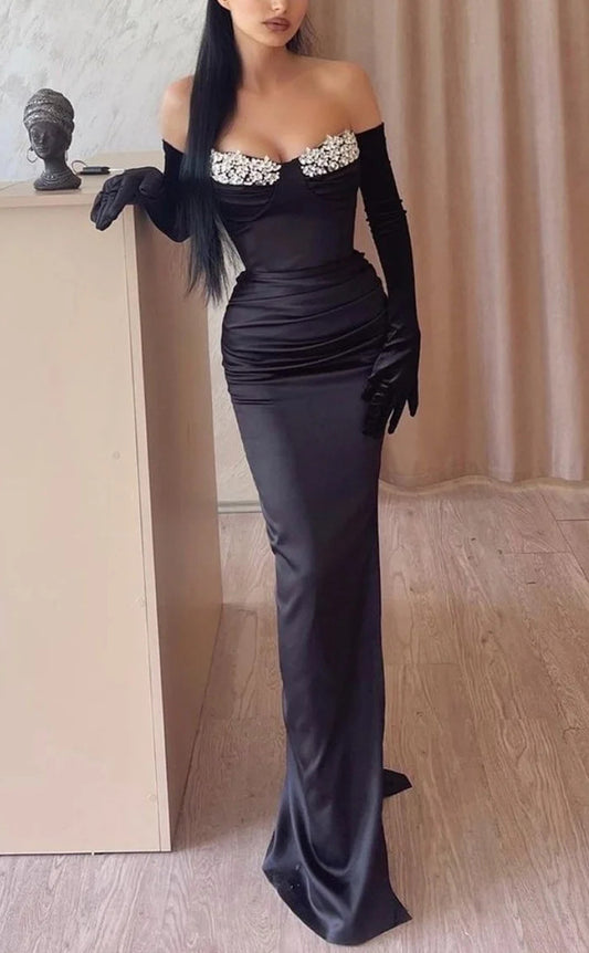 RP1107-Elegant Black Mermaid Sweetheart Beads Crystals Long Sleeves Long Prom Evening Dresses Formal Party Gowns