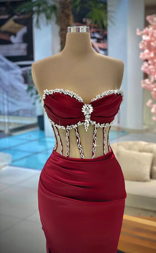 RP972-Unique Burgundy Mermaid Sweetheart Pleated Beads Crystals Sleeveless Prom Evening Dresses Formal Party Gowns