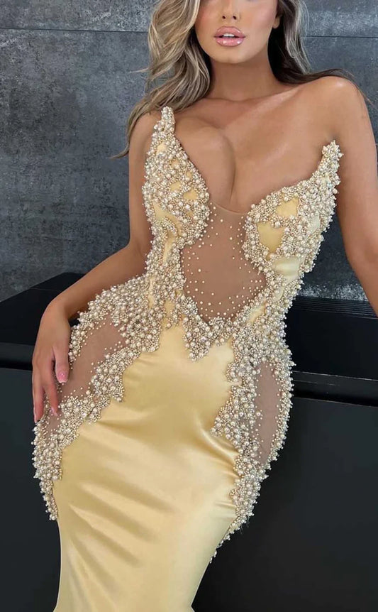 RP1014-Elegant Mermaid Sweetheart Pearls Crystals Sleeveless Long Prom Evening Dresses Formal Party Gowns