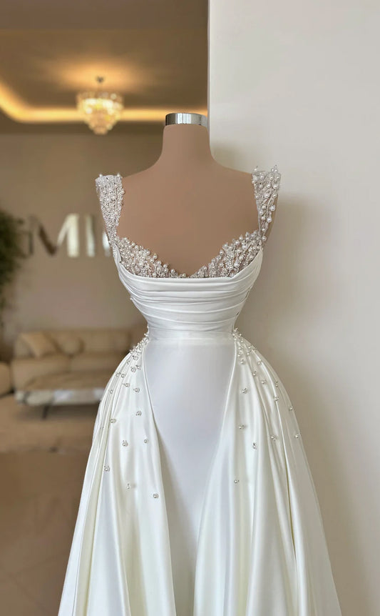 RP671-Elegant White Mermaid Sweetheart Pearls Ruched Cap Sleeves Satin Long Prom Evening Dresses Formal Party Gowns