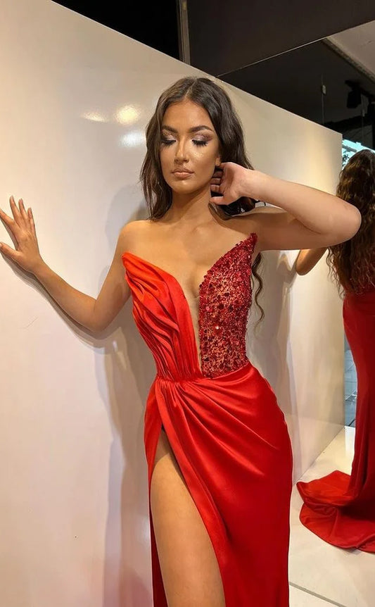 RP690-Eleagnt Red Mermaid Sweetheart Beads Sequins Sleeveless Long Prom Evening Dresses Formal Party Gowns With Slit