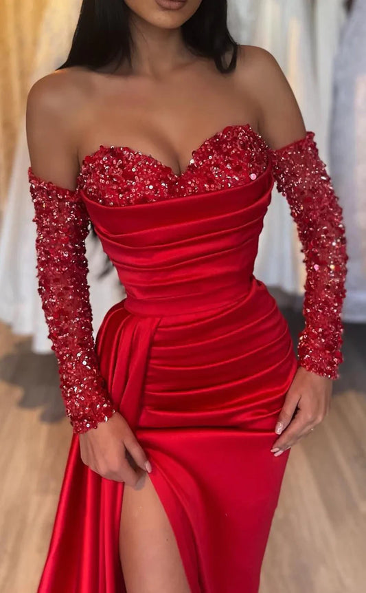 RP424-Elegant Red Mermaid Sweetheart Crystals Beads Ruched Long Sleeves Long Prom Evening Dresses Formal Party Gowns With Slit
