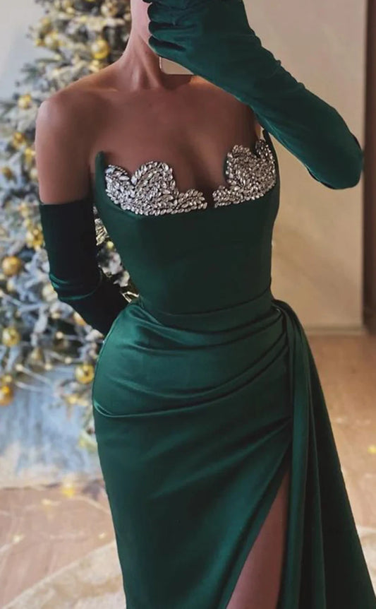 RP1964-Charming Green Mermaid Sweetheart Pleated Crystals Long Sleeves Satin Prom Evening Dresses Formal Party Gowns With Slit