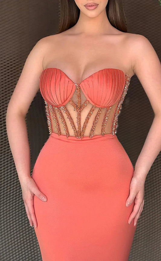 RP1943-Unique Orange Mermaid Sweetheart Beaded Crystals Sleeveless Satin Prom Evening Dresses Formal Party Gowns