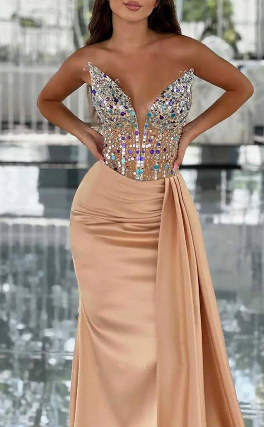 RP1929-Modern Champagne Mermaid Sweetheart Crystals Sequins Sleeveless Satin Prom Evening Dresses Formal Party Gowns With Slit
