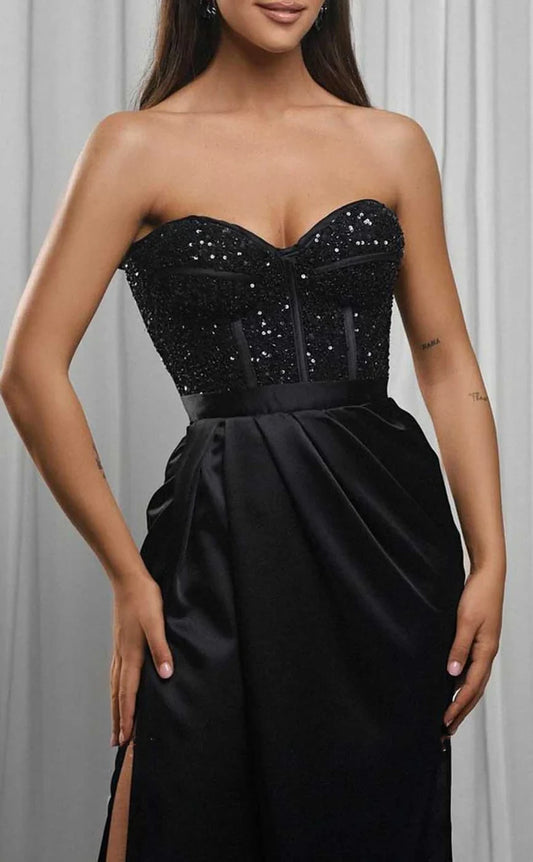 RP1909-New Black Mermaid Sweetheart Ruched Sequins Sleeveless Satin Prom Evening Dresses Formal Party Gowns With Slit