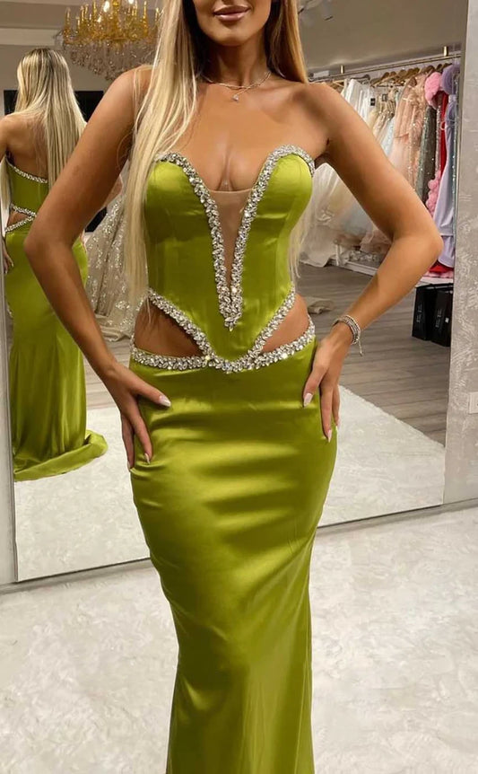 RP1914-New Olive Mermaid Sweetheart Ruched Beaded Sleeveless Satin Prom Evening Dresses Formal Party Gowns With Cut-out