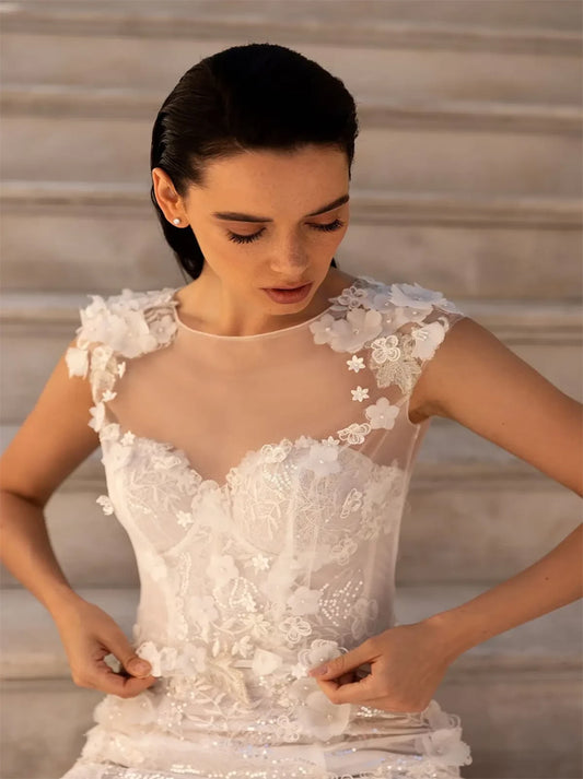 Elegant & Classic Mermaid Boho Wedding Sweetheart Beads Appliqued Cap Sleeves Lace Bridal Gowns With Detachable Sweep Train