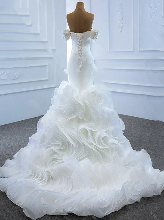 Charming White Mermaid Sweetheart Off The Shoulder Pleated Ruffles Lace Up Court Train Organza Wedding Bridal Dresses