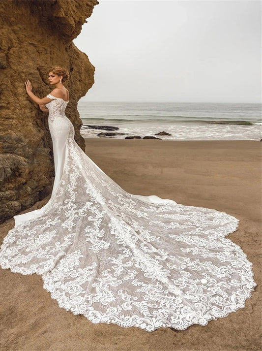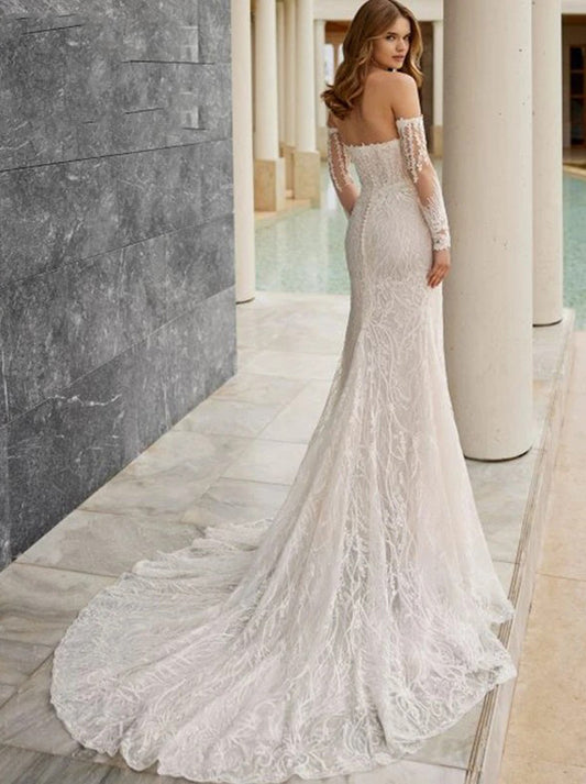 Sexy Mermaid Lace Wedding Dresses Sweetheart Off The Shoulder Sleeveless Court Train Lace Bridal Gowns