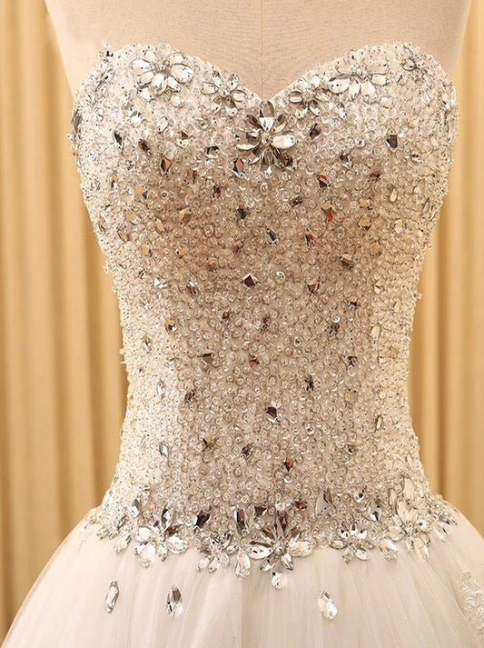 Sparkling Ball Gown Wedding Dresses Sweetheart Sleeveless Beads Crystals Appliques Court Train Tulle Bridal Gowns Custom Made