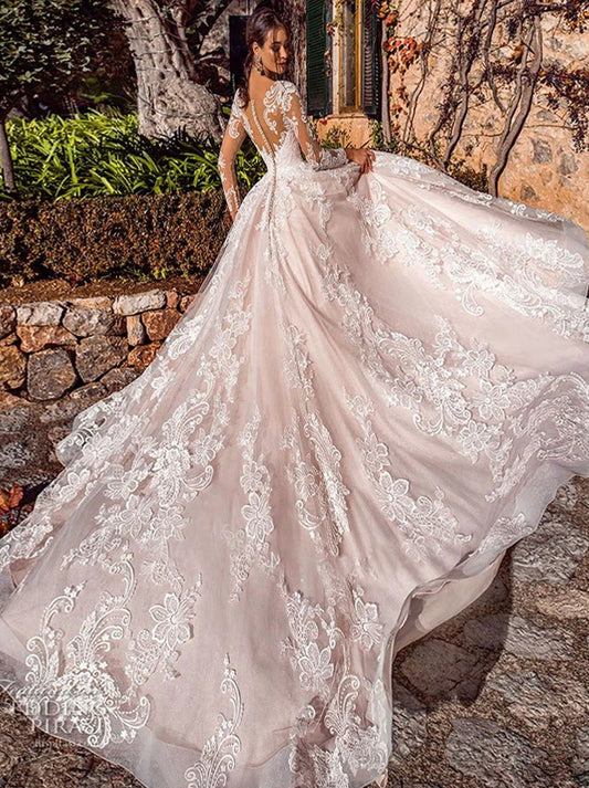 Exquisite Lace Appliques Ball Gown Long Sleeves Wedding Dress For Bride Buttons Illusion Back lACE Court Train Bridal Gown