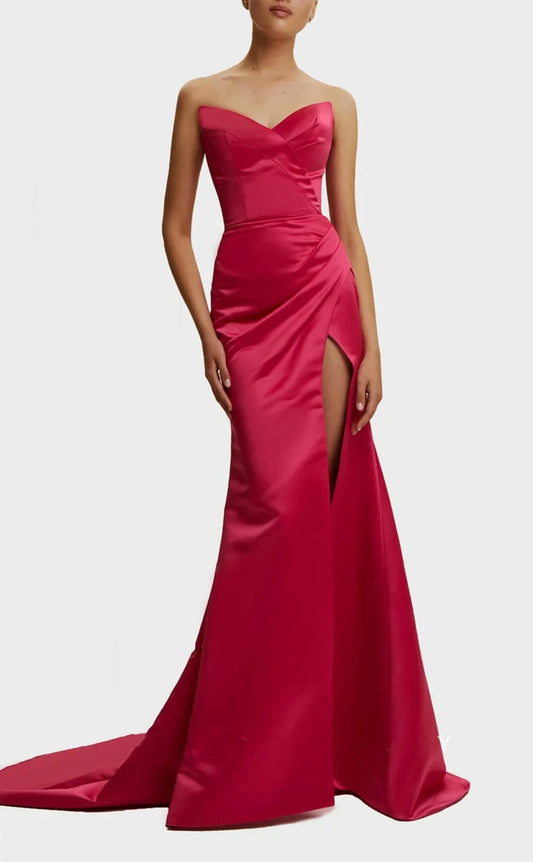 RP1254-Elegant Fuchsia Mermaid Sweetheart Ruched Sleeveless Satin Prom Evening Dresses Formal Party Gowns With Slit