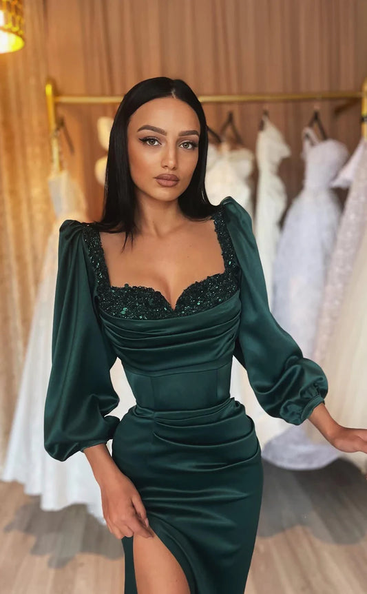 RP889-Elegant Green Mermaid Sweetheart Sequins Long Sleeves Satin Prom Evening Dresses Formal Party Gowns With Slit