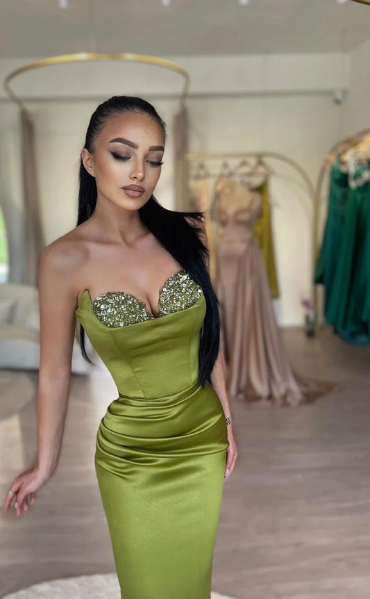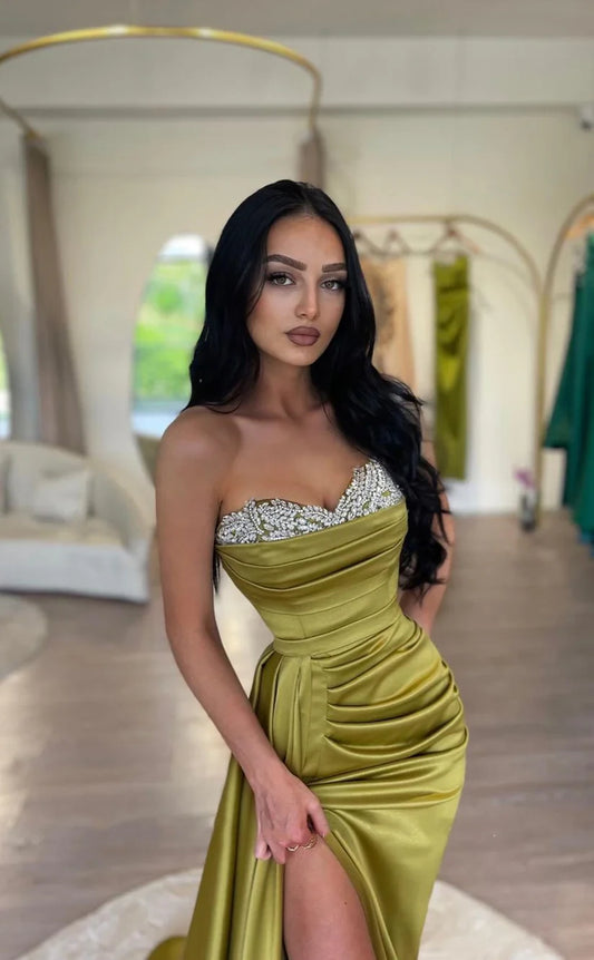 RP1784-Elegant Olive Mermaid Sweetheart Crystals Sleeveless Satin Prom Evening Dresses Formal Party Gowns With Slit