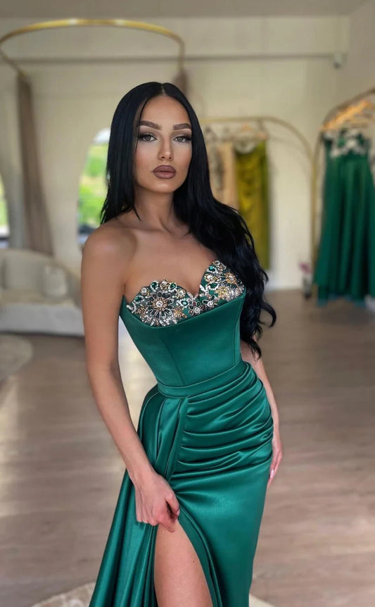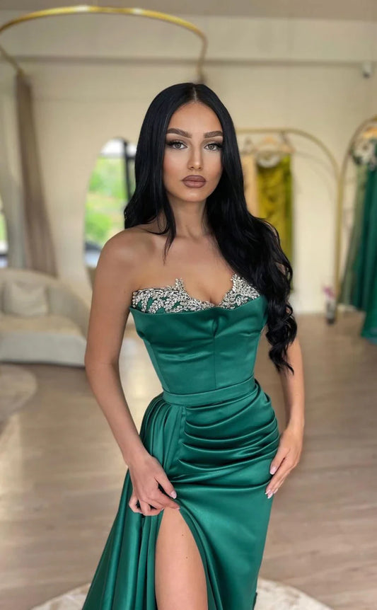 RP1782-Elegant Green Mermaid Sweetheart Crystals Sleeveless Satin Prom Evening Dresses Formal Party Gowns With Slit